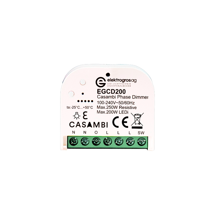 Der CASAMBI Dimmer EGCD200 ist ein besonders kompakter 230V-Phasenabschnittsdimmer, ideal für den Einbau in Standard-Unterputzdosen. Durch die platzsparende Bauweise und die mitgelieferte Zugentlastung bzw. Klemmenabdeckung kann der Dimmer auch für unabhängige Installationen verwendet werden.