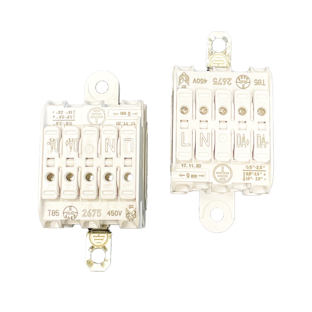 Besonders beliebt sind die 5-poligen Leuchtenklemmen mit Erdungsbügel 2675/SP, wahlweise mit oder ohne DALI-Beschriftung (L, N, Erde, DA+, DA-), die sich ideal für DALI-gesteuerte LED Systeme eignen.